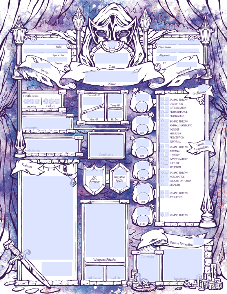 The delights of social intrigue, the thrill of masked capers, and the glorious sound of pouches overfull with gold pieces. This sheet is perfect for campaigns heavy on roleplay and/or city settings, but also make a natural fit for individual characters with such a background. Urchins, charlatans, performers, nobles - there are many reasons to don a mask in the city. This especially lends itself to Rogues and Bards, but many classes might have such lifestyles that call for subterfuge down the sidestreets.