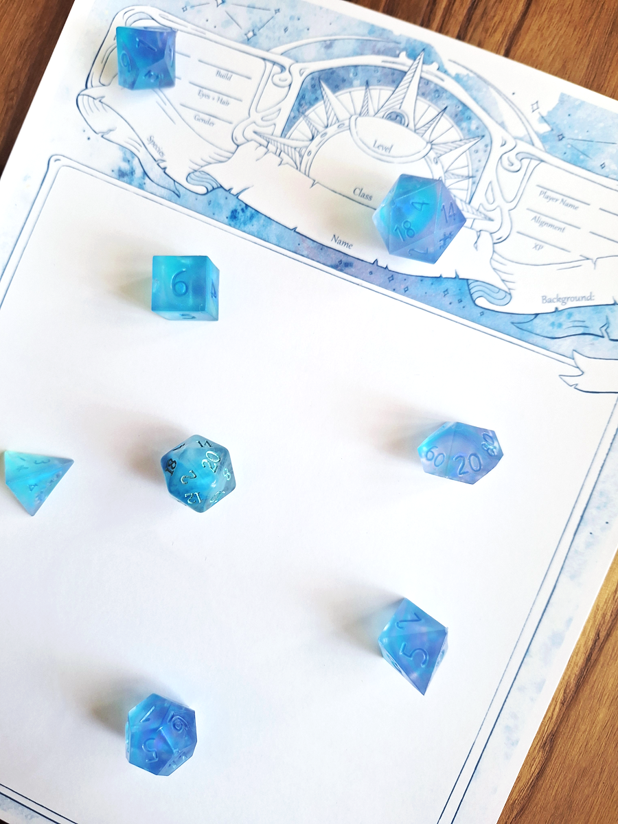 đź–¤Imperial Jasper dice by Norse Foundry. Blue sharp dice are by Kraken. Orange dice set seen on the Sunlit set are by Little Dragon Corp. Opal dice are by Crystal Maggie.