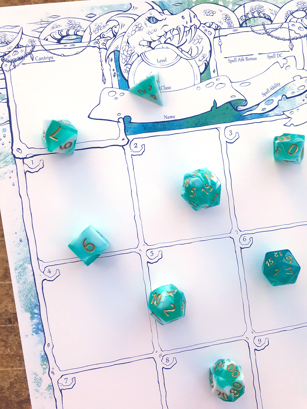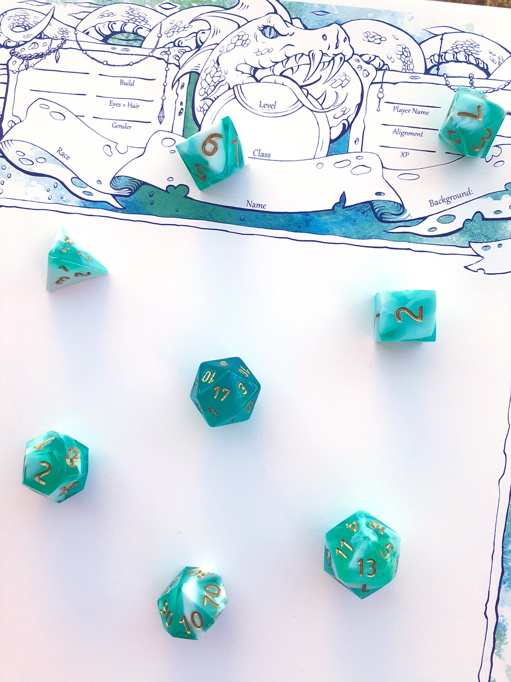 🖤 Gummi Blue Raspberry Smoothie Dice by Kraken (Hand-sanded from RAW), Teal Borealis dice from Chessex.